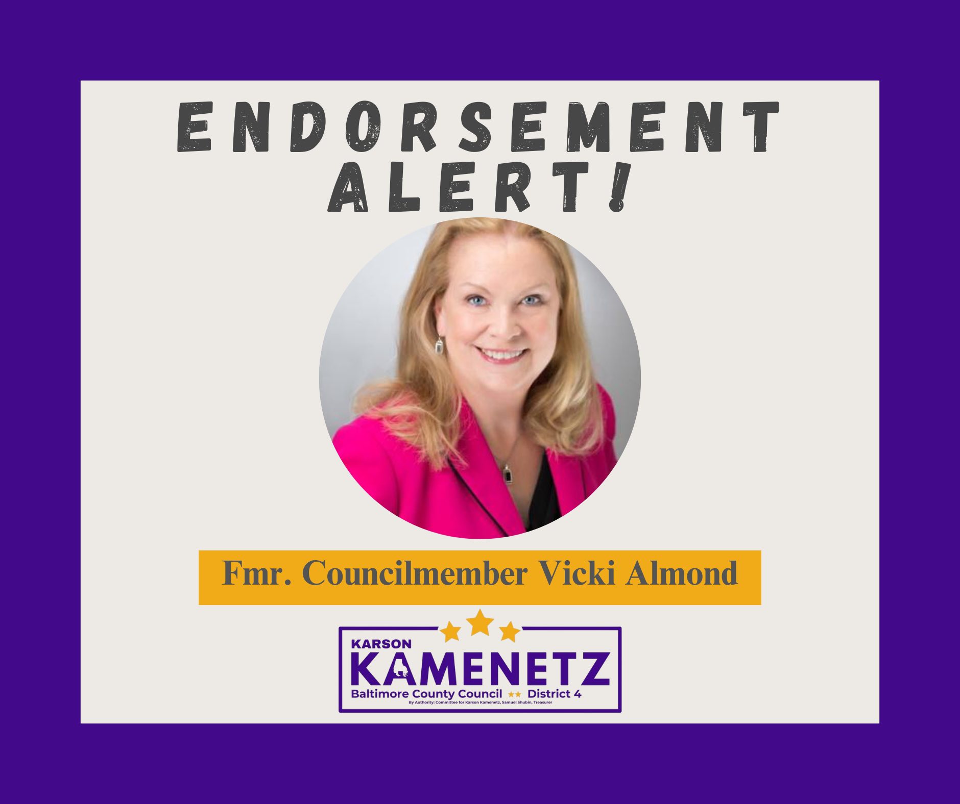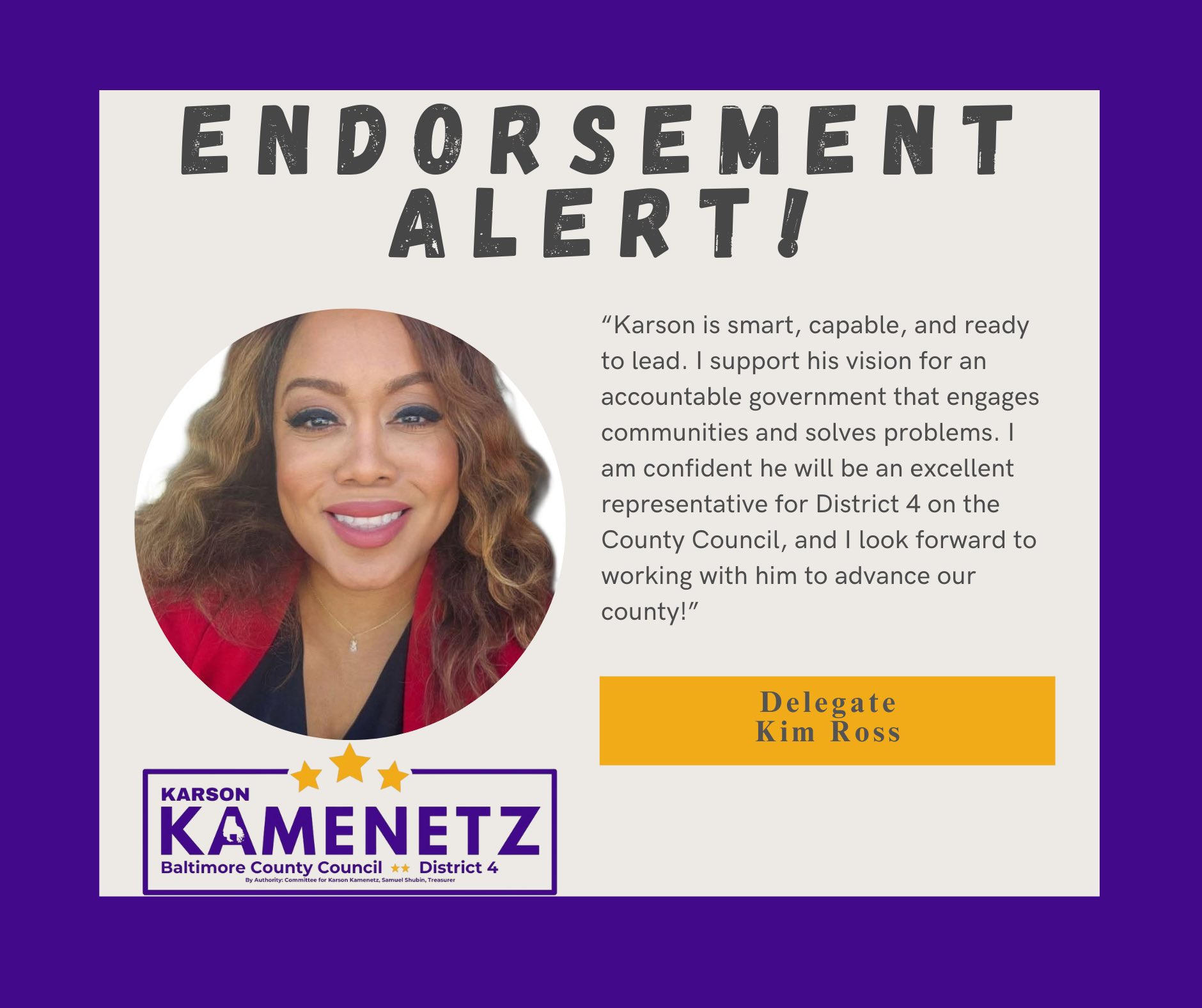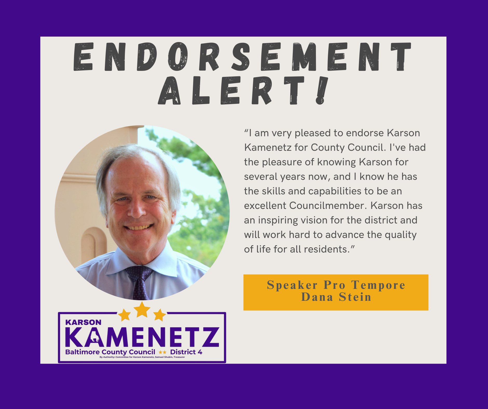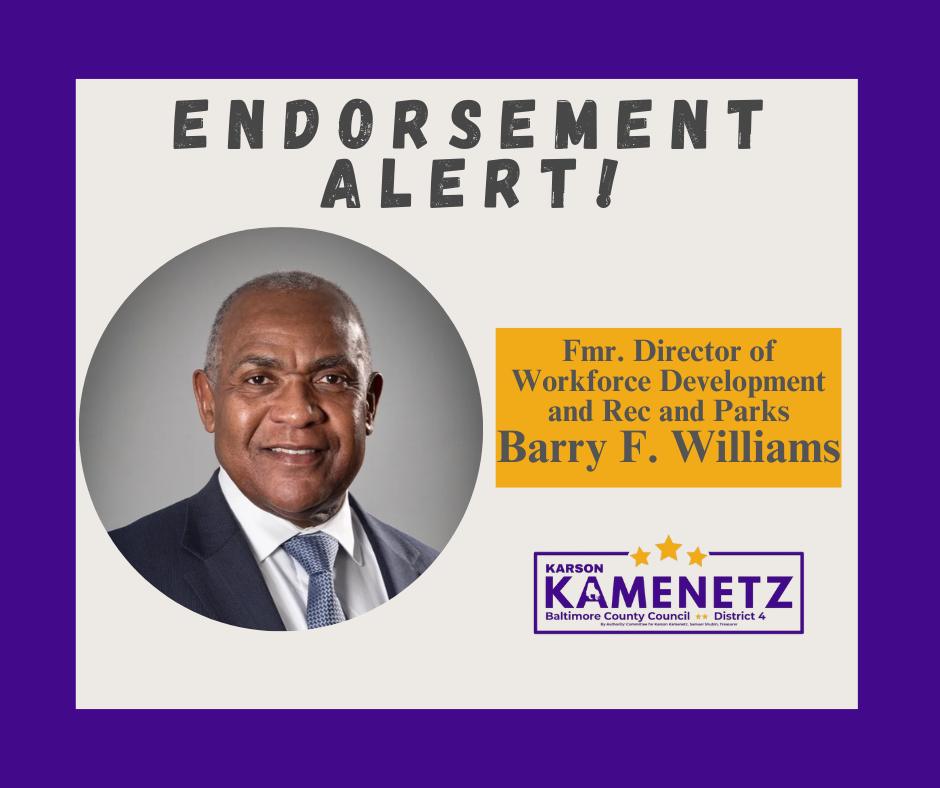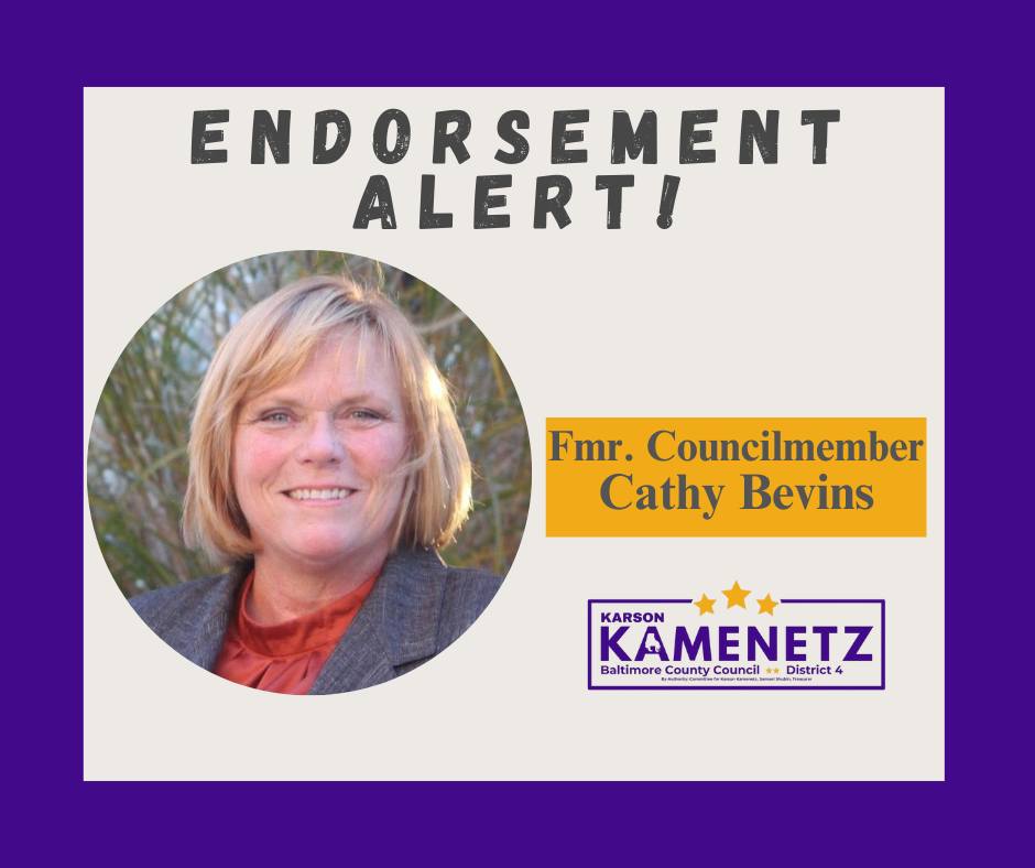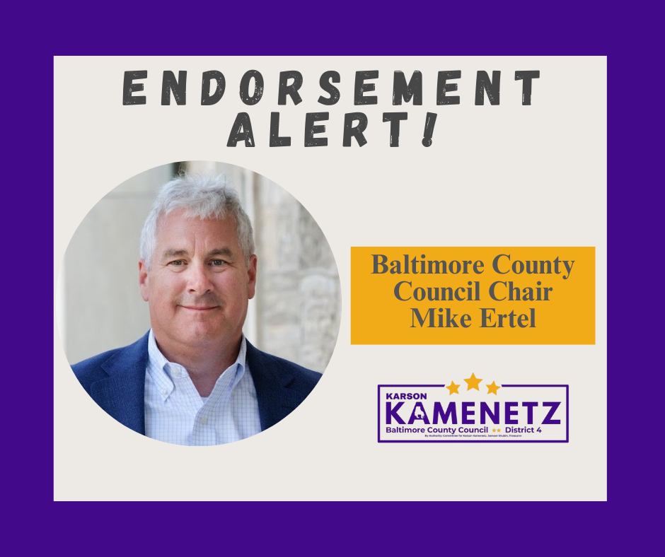 A growing list of elected officials, community members, and local organizations across Baltimore County are lining up behind Karson’s plan for sustainability and efficiency. They see the needs in District 4’s inner-beltway neighborhoods and suburban communities, and they trust Karson to deliver.