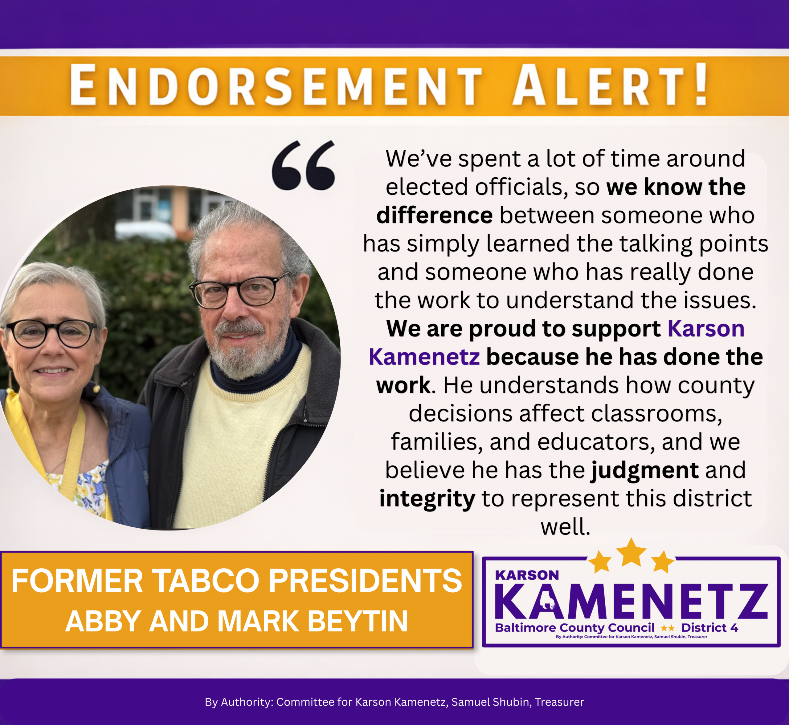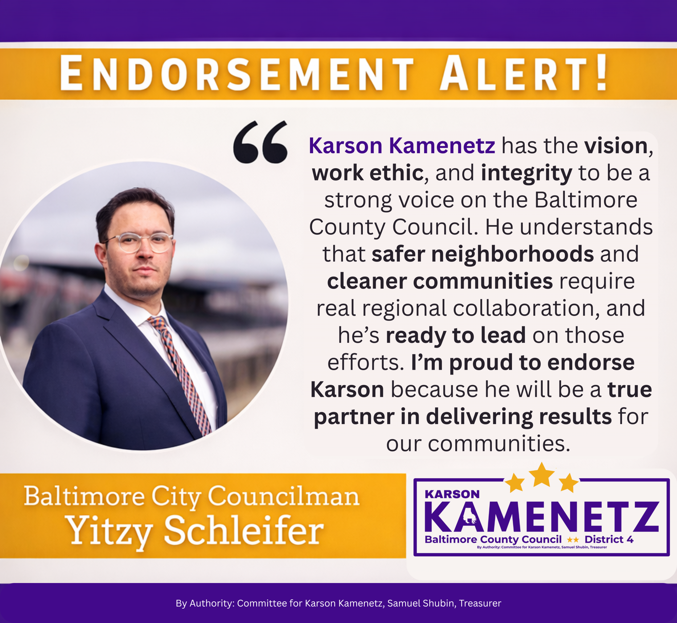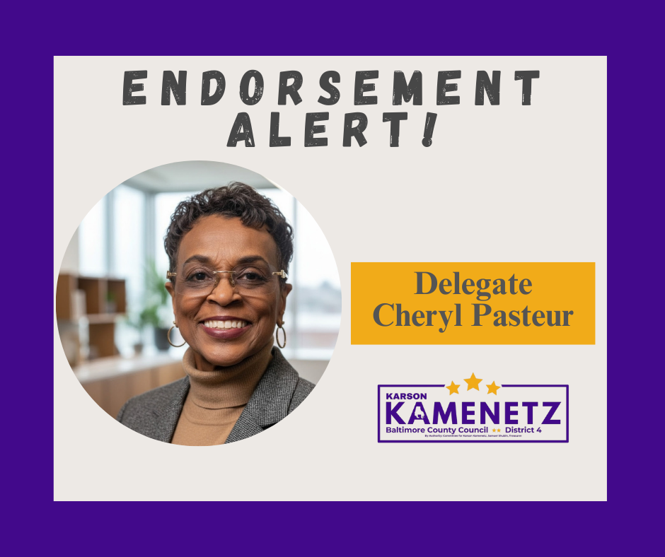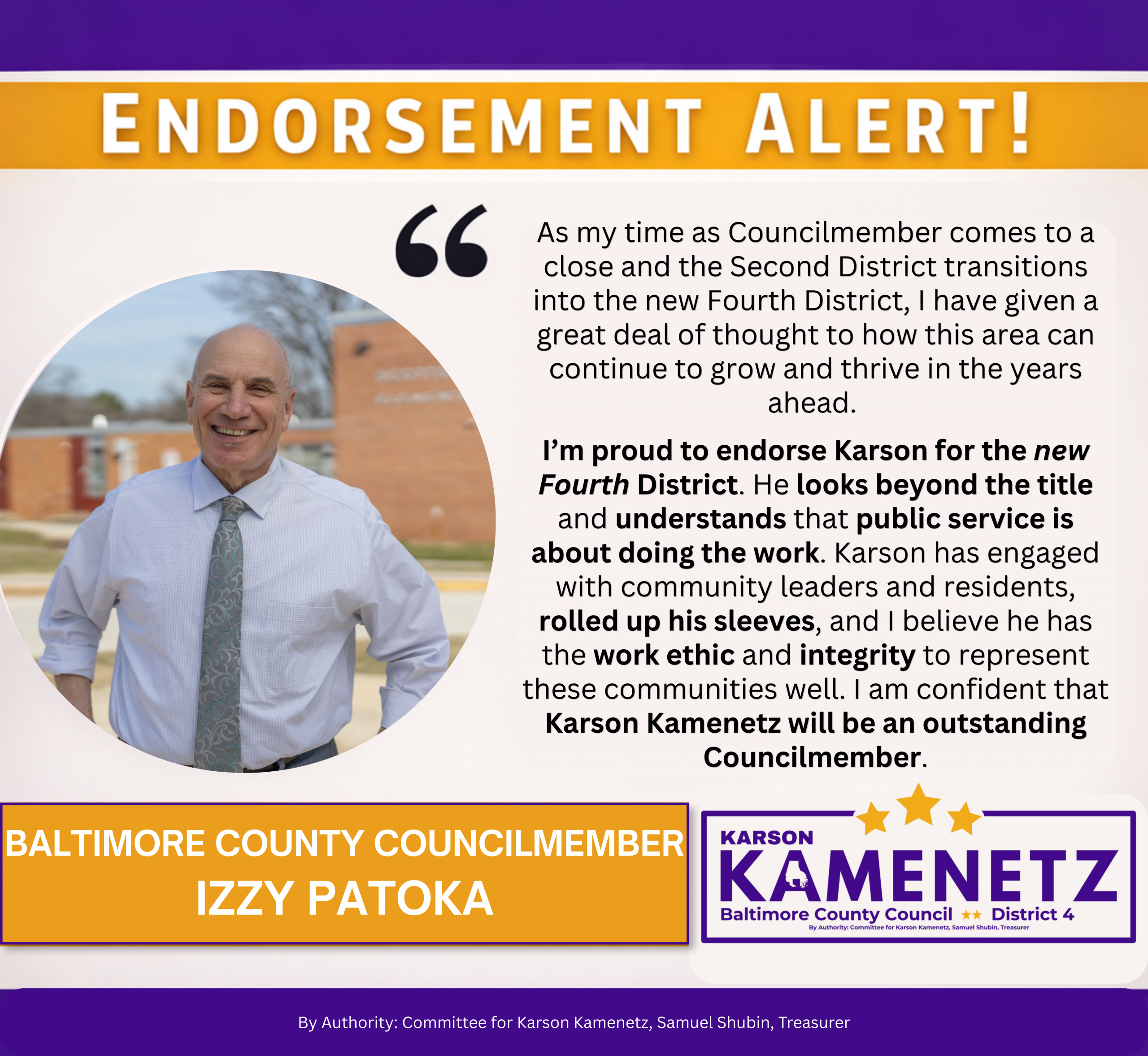 A growing list of elected officials, community members, and local organizations across Baltimore County are lining up behind Karson’s plan and vision. They see the needs in District 4’s inner-beltway neighborhoods and suburban communities, and they trust Karson to deliver on affordability, stronger schools, and building safer communities.